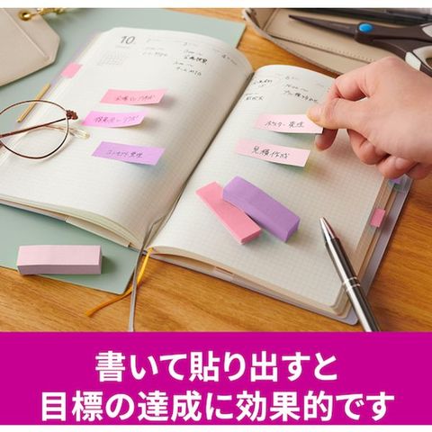 ・カラフルな4色のセットなので、色で識別したり、書いた部分を目立たせたりすることができます。・粘着力が2倍(当社通常粘着製品比)なので、つきにくい場所にもしっかりと貼れます。・紙製のふせんなので、筆記具を選ばずに使用できます。