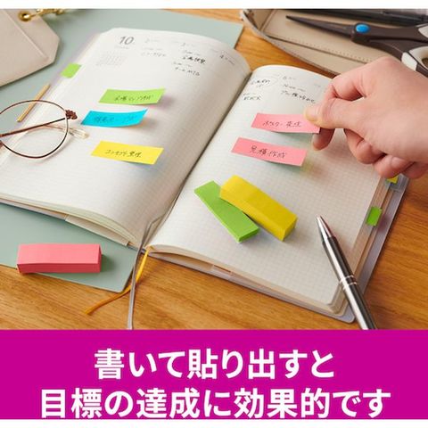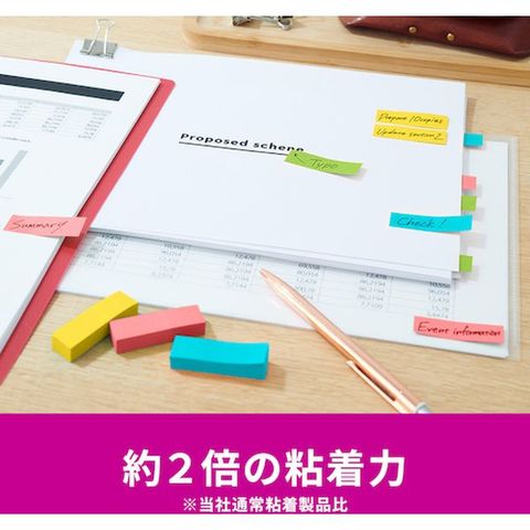 ・カラフルな4色のセットなので、色で識別したり、書いた部分を目立たせたりすることができます。・粘着力が2倍(当社通常粘着製品比)なので、つきにくい場所にもしっかりと貼れます。・紙製のふせんなので、筆記具を選ばずに使用できます。