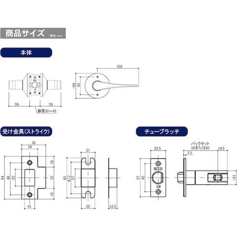 ・色:シルバー・バックセット(mm):50・60・適合扉厚(mm):30~42・タイプ:通路用(空錠)・幅(mm):141・縦(mm):66・長さ(mm):160・丸座径(mm):66・取付ビスピッチ(mm):43・施錠機能:なし