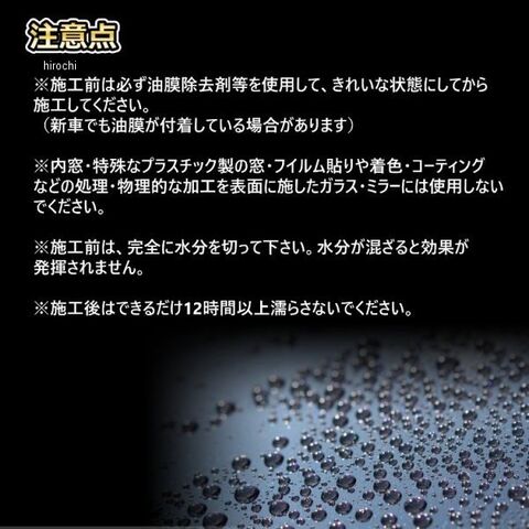 45km/hの低速走行でも雨粒が弾き飛び、良好な視界を確保します。フロントガラスで約3ヶ月-半年の持続性。ガラスに付いた汚れや油膜を除去してから施工してください。