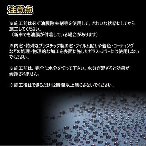 45km/hの低速走行でも雨粒が弾き飛び、良好な視界を確保します。フロントガラスで約3ヶ月-半年、ワイパーを使用しないサイドやリアガラスは約1年の持続力。ガラスに付いた汚れや油膜を除去してから施工してください。
