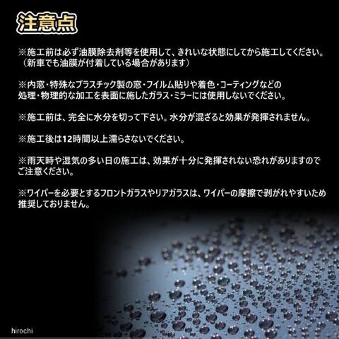 1度の施工で約1-2年の持続力があり、何度も塗りなおす手間がいりません。拭き取りも驚くほど簡単で、施工性がいいのが特徴です。ガラスに付いた汚れや油膜を除去してから施工してください。