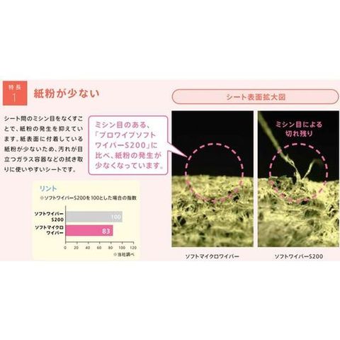 ・シート間のミシン目をなくすことでリントを少なくし分析精度、作業性がアップしました。・シートサイズが小さいので細かい汚れ拭きも簡単です。・1カートンあたりの入り数を多くしコストダウンに貢献しました。・カートン・段ケースをコンパクトにする事で、作業スペース・保管スペースを改善しました。