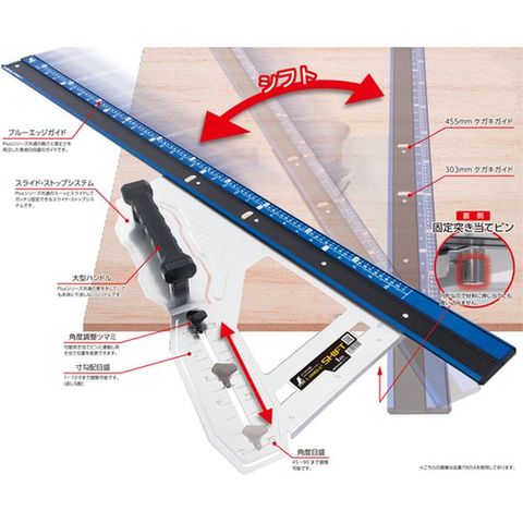 ・直角切断専用定規です。・ステン鋼付で丈夫です。・ガイド部は尺相当目盛とメートル目盛の併用目盛で、303mmと455mmのケガキガイド付です。・スライド・ストップシステム採用で滑らかにスライドし、しっかり固定することができます。