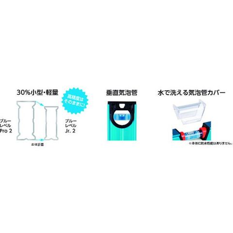 ・ブルーレベルProと比較して30%小型・軽量化しています。・水平気泡管カバーが取り外せますので、水洗い・交換が可能です。・水平・垂直・45°の測定が可能です。・本体底面にV字溝が付いていますので、パイプの上にも置くことができます。・暗い場所でも作業ができるよう、水平気泡管に蓄光シートが付いています。
