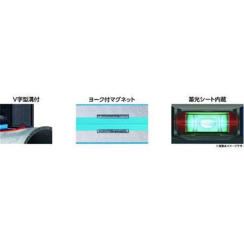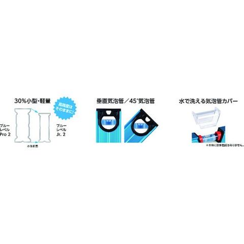 ・ブルーレベルProと比較して30%小型・軽量化しています。・水平気泡管カバーが取り外せますので、水洗い・交換が可能です。・水平・垂直・45°の測定が可能です。・本体底面にV字溝が付いていますので、パイプの上にも置くことができます。・暗い場所でも作業ができるよう、水平気泡管に蓄光シートが付いています。