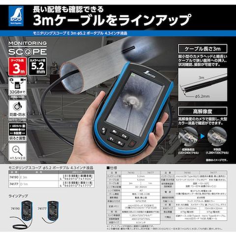・超小型のカメラヘッドと細長いケーブルで狭い箇所への挿入、状況確認、撮影が可能です。・高解像度のカメラで撮影し、大型カラー液晶(4.3インチ)で確認ができます。(1280×720ピクセル)・長い配管内も確認できる3mのケーブルを装備しています。(3m×Φ5.2mm)・動画・静止画を撮影し、microSDカードに保存、またはパソコンに出力が可能です(インターフェース micorUSB/Type-B出力)。・防塵・防水性能:カメラヘッド・カメラケーブル IP67※本体に防塵・防水機能なし。