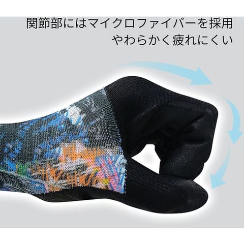・新素材水性ポリウレタンコーティングにより、耐油性と耐摩耗性があります。・タッチパネルに対応しています。・超極細繊維であるマイクロファイバー繊維は、肌との接触面に空間ができにくく、優れたフィット感や密着感をもたらします。・マイクロファイバーを使用することで肌との接触面が増加し、手袋内側のすべりを軽減します。・吸水性に優れたマイクロファイバー糸が、汗を空間内部に保持することでムレを抑制します。・背抜きの甲側だけでなく手のひらのコーティング部にも通気性があり、360度全方向通気でムレを軽減します。・ニオイや菌を抑制する、サニタイズ抗菌抑臭加工を施しています。・ピタッと吸着して掴みやすい、特殊すべり止めマイクロフィニッシュ加工が高いグリップ力を発揮します。・アート技法「コラージュ」のオリジナルデザインプリントを施しています。