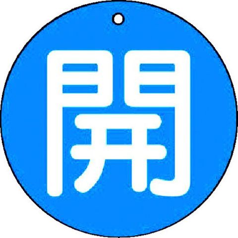 ・色:青・表示内容:開・青地(白文字)・縦(mm):50・横(mm):50・厚さ(mm):2・色(開):青・外径(mm):50・取付仕様:穴1ヵ所
