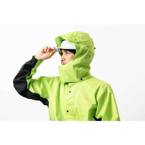 ・取り外し可能なヘルメット対応フードを装備したレインスーツです。