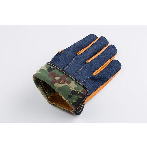 ・デニム生地と、牛本革を使ったちょっとおしゃれな作業手袋です。・使う時にテンションの上がる手袋です。・柔らかくごわつかない牛革製です。・甲側と袖口の裏地には迷彩の生地を使用しています。・カラビナ用の穴がついています。・袖口が広く、着脱が簡単です。