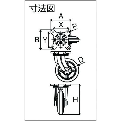 ・車輪径D(mm):75・タイプ:自在式・許容荷重(daN):70・許容荷重(kgf):75・車輪幅(mm):32・取付高H(mm):112.5・取付座A(mm):91・取付座B(mm):91・取付ピッチX(mm):65・取付ピッチY(mm):65・取付穴径P(mm):11・軸径d(mm):10