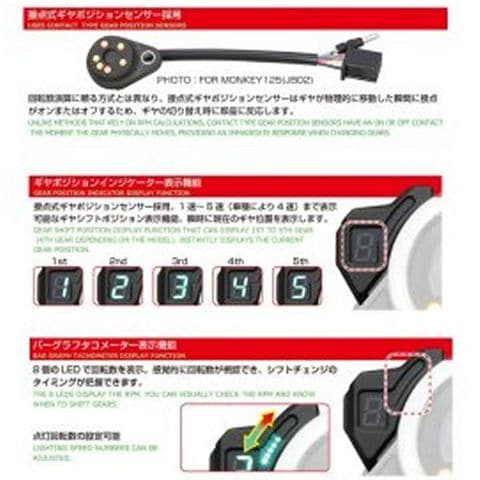 ・ギヤポジションインジケーター:接点式ギヤポジションセンサーにより、1速~最大5速までの表示が可能。瞬時に何速に入っているかを表示します。