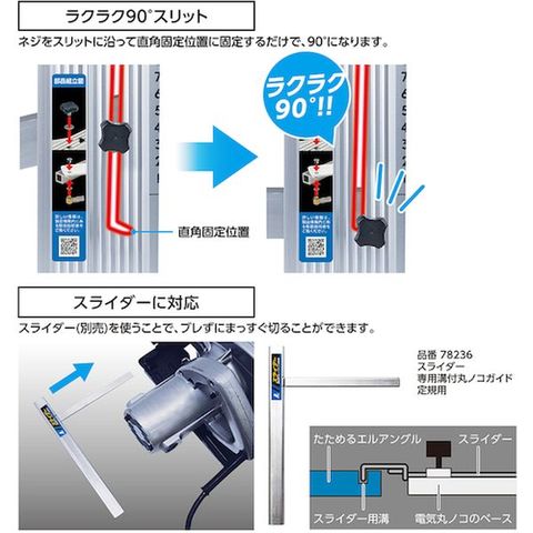 ・突き当てがたためて、持ち運びに便利です。・ネジをスリットに沿って直角固定位置に固定するだけで90°になります。