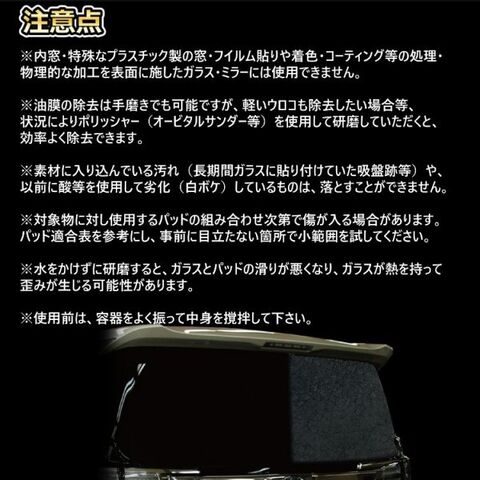 小さな粒子でキズをつけずに磨き上げ、鏡やガラスにクリアな輝きを取り戻します。油膜や古いコーティング膜も、こするだけで瞬時に除去が可能。