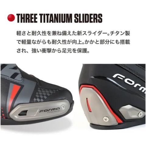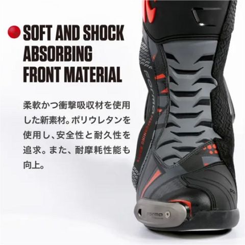 ブーツ工場として約40年間培ってきた高い技術をもつFormaより新型レーシングブーツ"PHANTOM"が登場。独自開発したV.F.Sにより、安全性・機能性共に向上。また、新しくなったスライダー、ソールにより今まで以上にレースシーンに特化したハイエンドレーシングブーツ。