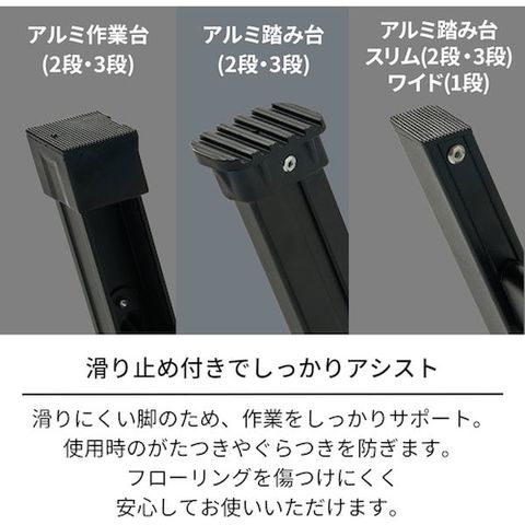 ・アルミ製で軽く、折りたたみ時はコンパクトに収納できる踏み台です。・カバー付きのストッパーでラクラク開閉、踏み台部分がワイドで安定感があり、作業性に優れています。・脚部分にすべり止め付きで、安心してお使いいただけます。
