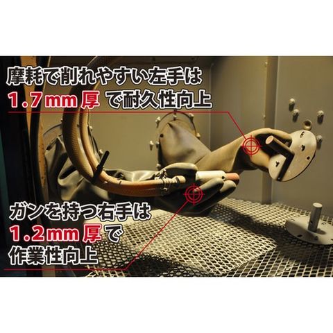 ・天然ゴム製ブラスト手袋です。・天然ゴムに制電配合をしていますので、研磨時の帯電を抑制し、粉じん爆発や不快なビリビリ感を防ぎます。・キャビネットに手袋を固定可能なフランジ付と、袖口ストレートのフランジなしがあります。・手袋内側に塩素処理を施しているため、着脱しやすくなっています。・右手は作業性を、左手は耐久性をそれぞれ追求した厚みになっています。