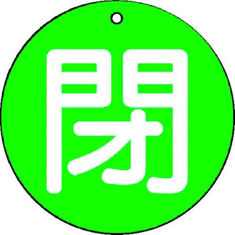 ・色:緑・表示内容:閉・緑地(白文字)・縦(mm):50・横(mm):50・厚さ(mm):2・色(閉):緑・外径(mm):50・取付仕様:穴1ヵ所