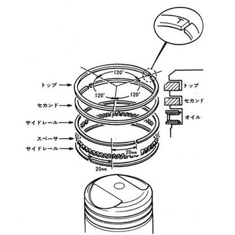 順番通りに入れないと全く入りませんので必ず順番を守って入れて下さい。古いピストンリングを外した後、溝のカーボン(汚れ)を完全に落とさないとリングがスムーズに入りませんのでご注意下さい。