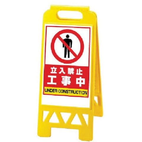・表示内容:立入禁止工事中 UNDER CONSTRUCTION・間口(mm):300・奥行(mm):37・高さ(mm):680・色:イエロー・摘要:折りたたみ式・両面表示・寸法(mm):680×300×37・表示ステッカー寸法(mm):417×257・本体色:イエロー