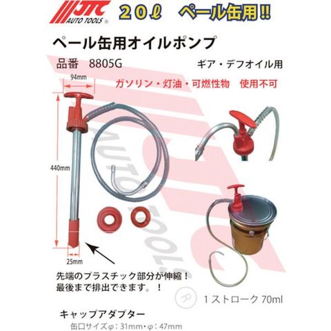 ・ペール缶にセットし、レバーを上下にストロークすることでオイルを注入する事が出来ます。・ 20Lペール缶から直接注入できます。・ギア・デフオイル・ATF・エンジンオイル使用可能 です。