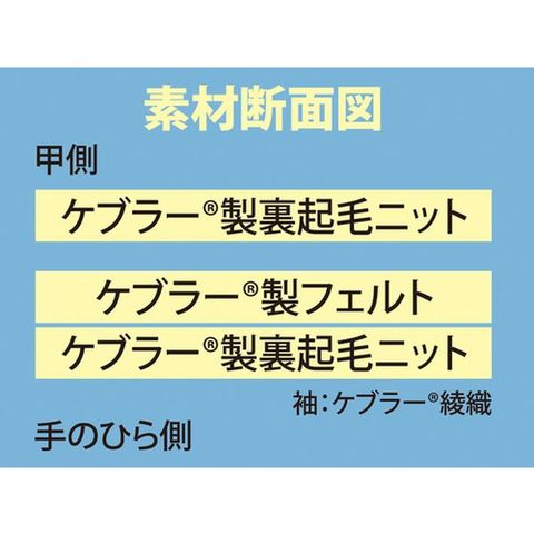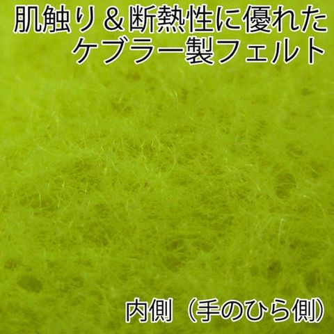 ・ケブラー[[R下]]製フェルトを手のひら側に使用しており、断熱性に優れています。・ケブラー[[R下]]製で、耐熱性、耐切創性に優れています。
