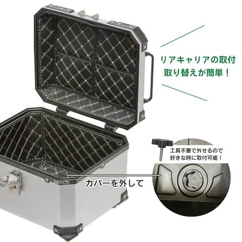 ヘルメットの収納も可能な大容量リアボックスです。鍵付きなので防犯対策もできます。内装は高級感とクッション性の高いダイヤカットデザインのPVCレザー。実用性と装飾性を兼ね備えたボックスです。