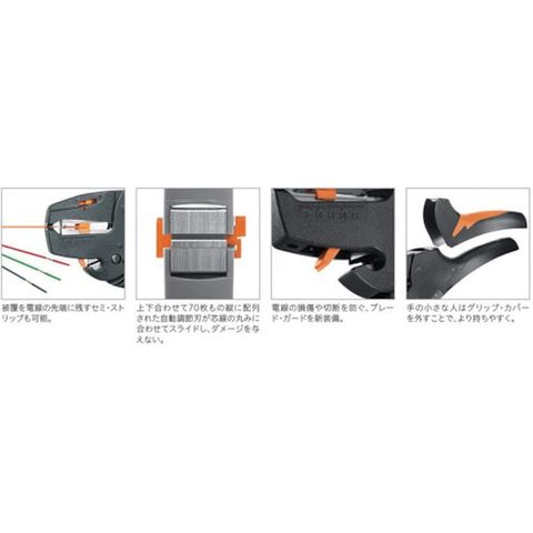 ・電線サイズの調整不要で縦に配列された独自のスライドする自動調整刃は、芯線の丸みに合わせてスライドし、芯線にダメージを与えることなくストリップ可能です。・ストリップした被覆を電線の先端に残す中間ストリップも可能です。 ・グリップ・カバーを取り外すとハンドル部が小さくなり、手の小さな方にも快適な作業を提供します。
