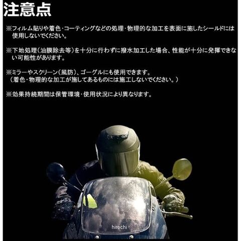 雨の日でも視界がスッキリ、夜間の対向車のヘッドライトギラつきも軽減されます。シールドの他、バイクのスクリーンやミラーにも使えます。効果持続期間は1-2年。