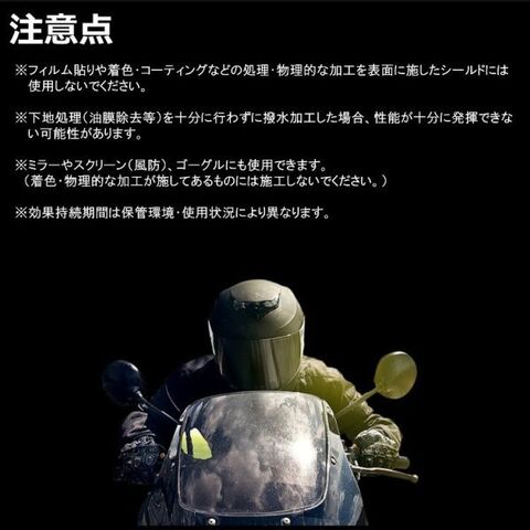 バイクのヘルメットシールド専用撥水コーティング剤です。塗って拭き取るだけの簡単施工で、約1-2年の持続力があります。