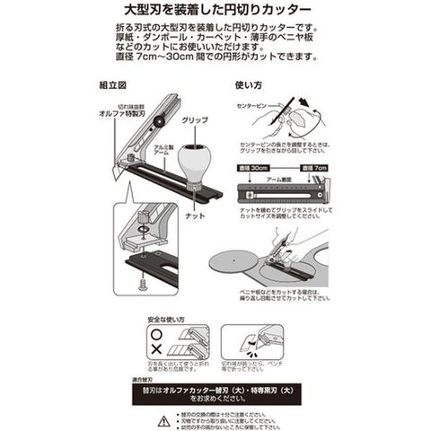 ・大型カッター刃を装着した強力円切りカッターです。・ダンボールベニヤ板などの円切り用です。・直径7~30cmまで対応しています。