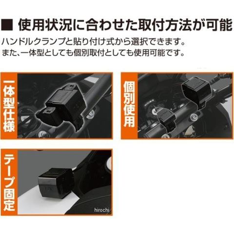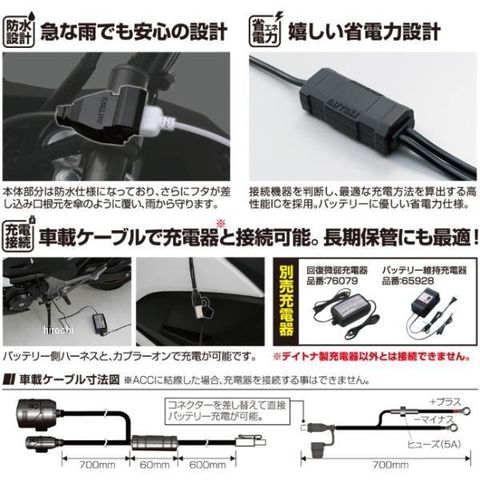 使用状況に合わせて取付方法を選べます。シガーソケット本体とUSB本体を組み合わせて取り付けが可能。電源差し込み口を覆う本体キャップで急な雨でも安心。別売のデイトナ充電器に差し替えることで車体のバッテリーに充電することができます。