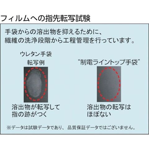 ・指全体を導電系のみで編み上げた静電気対策用指先すべり止め手袋です。・硫化銅複合繊維を使用し、優れた導電性により摩擦・接触帯電を防止します。・長繊維を使用し、手袋からのホコリや糸くずが発生しにくい低発じん性手袋です。・発泡ポリウレタンを指先にコートし、すべり止め効果・通気性にも優れています。・手袋からの溶出物を抑えるために繊維の洗浄段階から工程管理を行っています。・中性洗剤による洗濯ができます。