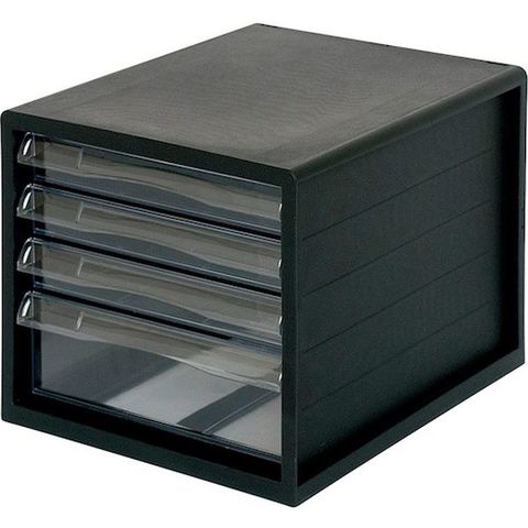 ・間口(mm):282・奥行(mm):344・高さ(mm):260・段数(段):4・色:ブラック・本体色:ブラック・引出し色:透明・引出し:浅型3個、深型1個・引出し内寸(mm)間口:243・引出し内寸(mm)奥行:314・引出し内寸(mm)高さ:36(浅型)79(深型)・浅引出し内寸(mm):W243×D314×H36・深引出し内寸(mm):W243×D314×H79・A4ファイル寸法目安(約):タテ307×ヨコ230×背幅15mm・A4クリアホルダー寸法目安(約):タテ310×ヨコ220~235mm。・引出し内寸(mm)間口×奥行×高さ:243×314×36(浅型)79(深型)