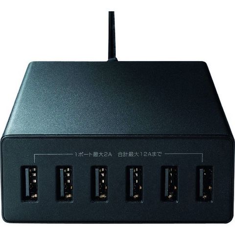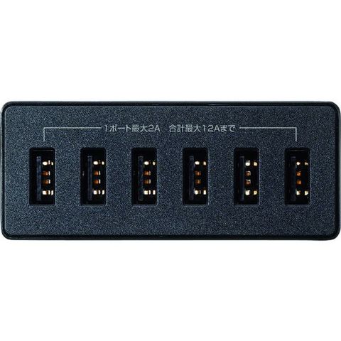 ・最大6台のスマートフォンやタブレットなどをまとめて充電できる、合計最大出力12Aに対応した高出力タイプのUSB充電器です。・USB出力は1ポートあたり最大2Aまで対応しており、最大6台のUSB充電対応機器を同時に充電することができます。・横置き、縦置きどちらにも対応しています。・日本メーカー製コンデンサを採用した約30000時間の高耐久設計により長寿命化を実現しています。・トラッキング火災を予防する絶縁キャップ付きACプラグを採用しています。・ケースには難燃性樹脂(UL94規格V-0相当)を採用しています。・接続機器の負荷電流が本製品の最大出力を超えた場合、出力を停止します。