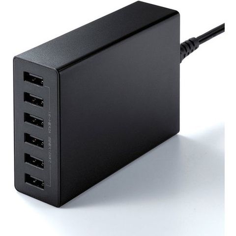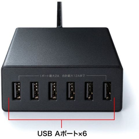 ・色:ブラック・ポート数:6・幅(mm):106・奥行(mm):32・高さ(mm):78・ケーブル長(m):1・定格入力:AC100V50/60Hz・定格出力:DC5V/12A(6ポート合計最大)、DC5V/2A(1ポートあたり最大)