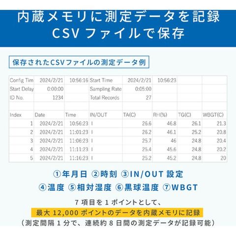 ・※本製品は、熱中症発症を完全に防止できる製品ではありません。・※熱中症の発症は、温度、湿度、輻射熱などの温熱環境、性別、年齢、既往歴や健康状態などの個人差、運動、労働、日常生活活動などの状況、など様々な要因が作用します。ご使用にあたっては、本製品の特性をよくご理解の上、あくまで目安としてお使いください。・※本製品をご使用中、気分が悪くなった場合には、本製品の表示に係わらず、涼しい場所に移動したり、医師の診察を受けるなどの処置をしてください。・※本製品は風速0.3m/s未満の環境では正しく測定できない可能性があります。風速が0.3m/s未満の微風あるいは無風速の環境で使用する場合は注意が必要です。・※市販の充電専用のUSBケーブルでは、データ記録機能の設定や記録データの通信はできません。必ず、付属品や別売品のUSBケーブルのようなデータ通信可能なUSBケーブルを使用してください。
