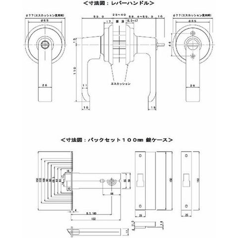 ・色:シルバー・バックセット(mm):100・ケース深さ(mm):122・適合扉厚(mm):25~40・幅(mm):26・長さ(mm):110・デットボルト(mm):15・丸座径(mm):65・取付ビスピッチ(mm):44