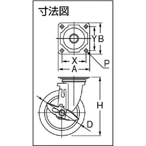 ・車輪径D(mm):150・タイプ:自在式(ストッパー付)・許容荷重(daN):180・許容荷重(kgf):184・車輪幅(mm):38・取付高H(mm):190・取付座A(mm):102・取付座B(mm):102・取付ピッチX(mm):80・取付ピッチY(mm):80・取付穴径P(mm):11.0・許容荷重(N):1800