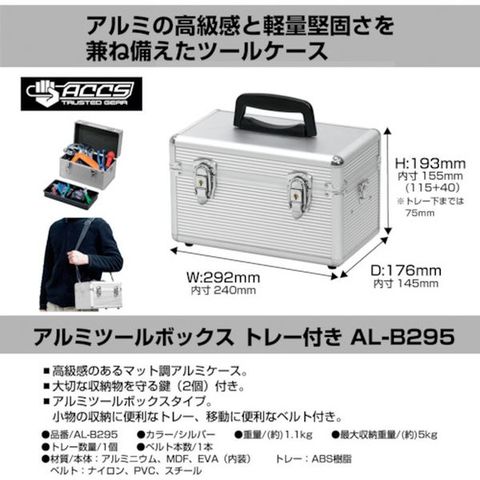 ・内側はEVA樹脂で全面表面加工してあり、傷がつきにくく収納物を衝撃から守ります。・アルミの高級感と軽量堅固さを兼ねそなえたツールケースです。