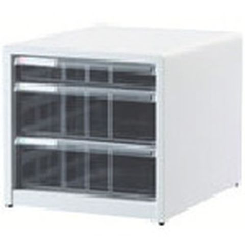 ・間口(mm):277・奥行(mm):336・高さ(mm):263・段数(段):3・色:ホワイト・本体色:ホワイト・引出し色:透明・タイプ:A4タテ型・引出し:浅型1個、深型2個・引出し内寸(mm)間口:233・引出し内寸(mm)奥行:307・引出し内寸(mm)高さ:36(浅型)80(深型)・対応オプション仕切板(別売り):A4浅引出し用 AW-12S(タテ仕切1・ヨコ仕切2) ・A4浅引出し用 AW-22S(タテ仕切2・ヨコ仕切2) ・A4深引出し用 AW-11M(タテ仕切1・ヨコ仕切1)