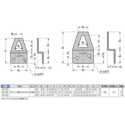 ・吊下荷重(N/kgf):98N/10kgf・吊下荷重(kgf):10・幅(mm):25・奥行(mm):9.5・高さ(mm):37.5・厚さ(mm):1.5・A(mm):14.7・B1(mm):25・B2(mm):11.5・B3(mm):11.5・H(mm):37.5・P1(mm):14・P2(mm):6.5・T(mm):8・d(mm):3.3・t(mm):8・取付穴数(個):2・表面処理:研磨・P3(mm):9・E1(mm):2.5・E2(mm):20.5・E3(mm):17・付属ねじ:十字穴付き丸木ねじ3.1×16(ステンレス鋼)