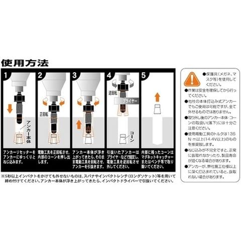 ・アンカーが弊社施工仕様以上に深く打込まれていると、抜き取れない場合があります。・取り外し後のアンカー本体、コーンの取扱い(落下)には十分ご注意ください。