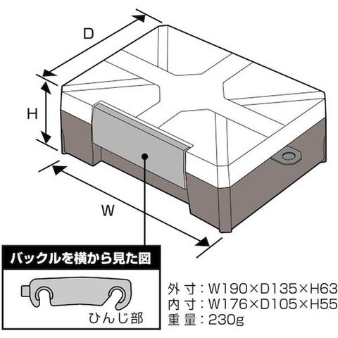 ・色:上蓋:白半透明、底:グレー、バックル:赤半透明・外形寸法(mm)間口:190・外形寸法(mm)奥行:135・外形寸法(mm)高さ:63・有効内寸(mm)間口:176・有効内寸(mm)奥行:105・有効内寸(mm)高さ:55・耐荷重(kg):1000(上面全体)