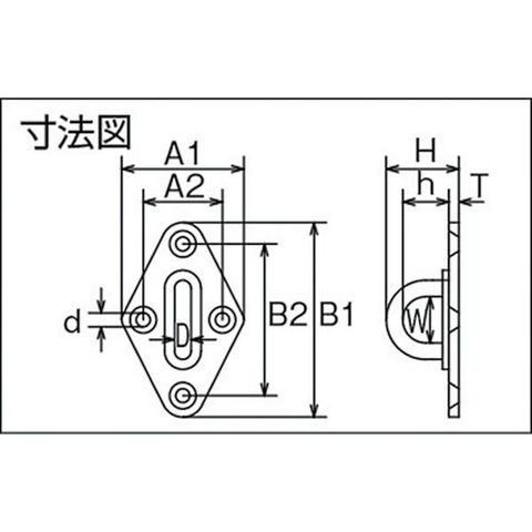 ・使用荷重(kN):0.20・A1(mm):40・D(mm):6・A2(mm):27・B1(mm):64・H(mm):25・W(mm):18・B2(mm):51・d(mm):4.2・h(mm):14・T(mm):3