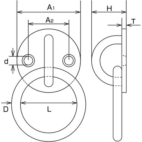 ・使用荷重(kN):0.15・A1(mm):33・D(mm):5・A2(mm):19・L(mm):30・H(mm):20・d(mm):4.2・T(mm):2.5