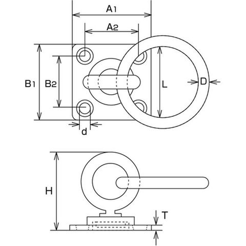 ・使用荷重(kN):0.20・A1(mm):40・D(mm):6・A2(mm):26・L(mm):40・B1(mm):40・H(mm):38・B2(mm):26・d(mm):5・T(mm):2.5