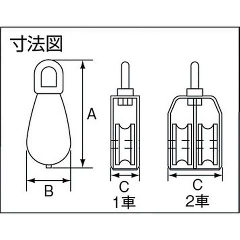 ・基本使用荷重(t):0.24・最大使用ロープ径(mm):15・車数:1・車径(mm):50・寸法(mm)A:127.0・寸法(mm)B:54・寸法(mm)C:30・タイプ:ベケなし1車