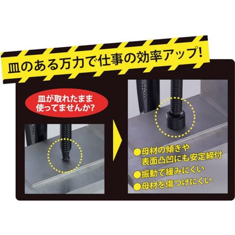 ・シャコ万力の皿が外れた際、専用工具なして皿部分の交換が可能です。・本体の買い替えに比べて経済的に修復が可能です。・皿を取り付けることで母材の傾きや表面凹凸にも安定締付でき、仕事の効率がアップします。